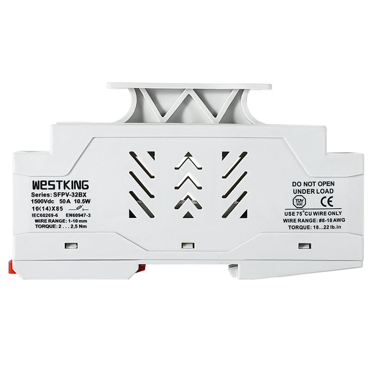The SFPV-32BX photovoltaic fuse base is compatible with both 1500VDC 10X85MM and 10/14×85MM photovoltaic fuses, with a maximum rated current of up to 50A. The development of this PV fuse holder is based on in-depth communication and testing verification with numerous photovoltaic base station users by WESTKING.The SFPV-32B 1500VDC fuse holder features an advanced heat dissipation structure, with channels for hot air flow between poles, effectively reducing temperature superposition generated by the fuse. The internal space is designed to allow the fuse to hang freely, preventing it from touching the holder's plastic shell and reducing the risk of burning and carbonizing the plastic.